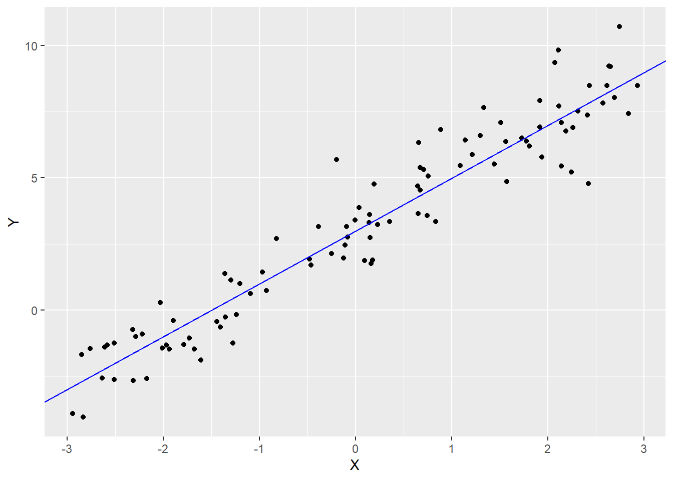 dat <- tibble(X = runif(100, -3, 3), Y = 3 + 2 * X + rnorm(100))