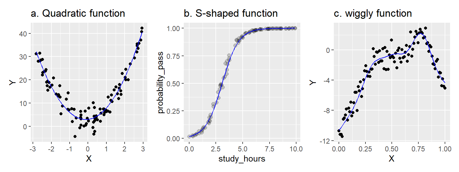在左边面板中,我们使用线性模型\(Y = \beta_0 + \beta_1 X + \beta_2 X^2\)捕捉了一个二次(抛物线)函数。X和Y之间的关系是非线性的,但模型本身是线性的。我们对预测变量\(X\)进行了平方处理,但系数\(\beta_0\)、\(\beta_1\)和\(\beta_2\)并没有被平方、立方或类似的处理(它们都是”一次幂”)。